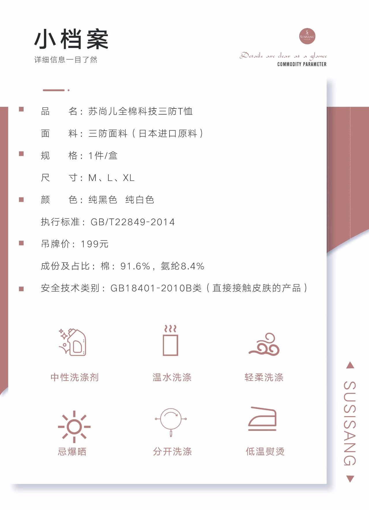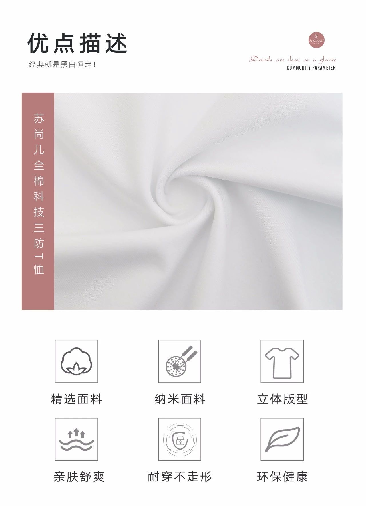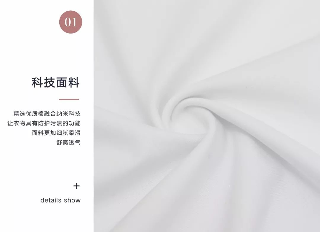 精選優質棉融合納米科(kē)技(jì),讓衣物(wù)具有(yǒu)防護污漬的(de)功能(néng),面料更加★細膩柔滑,舒爽透氣。